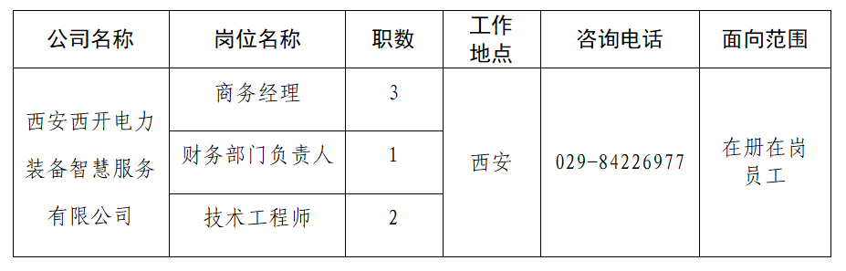 西安西开电力装备智慧服务有限公司作为西安尊龙凯时开关电气有限公司的全资子公司,拥有高压、超高压、特高压开关设备的售后安装、智能运维和系统工程整体解决方案的能力。公司成立以来,秉承“智造精品、创新服务、成就客户”的经营理念,强化科技创新,奋力开拓市场,一切从顾客出发,努力为顾客创造价值。本次面向公司内部公开招聘岗位信息如下: